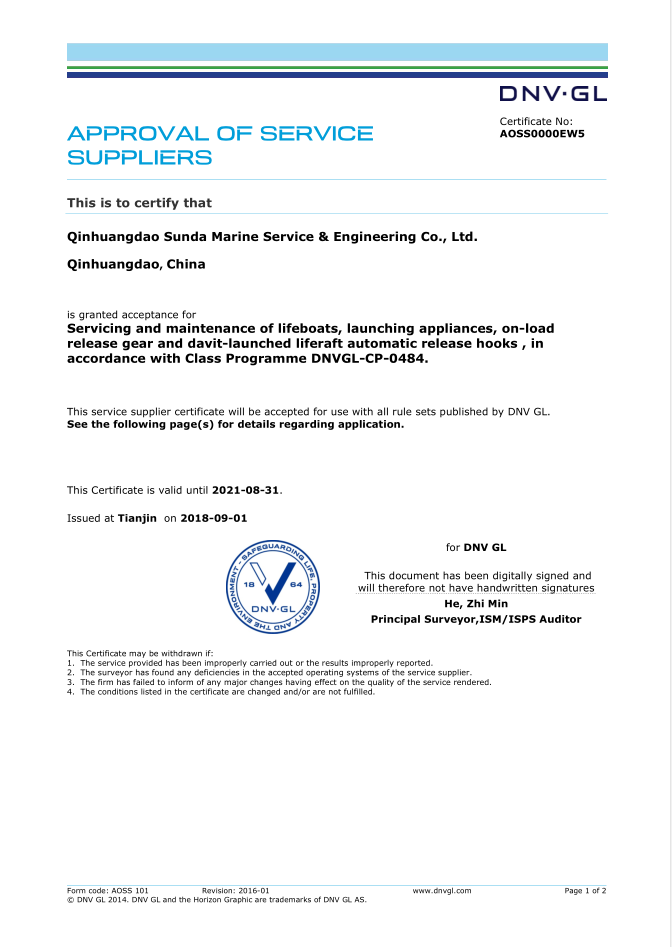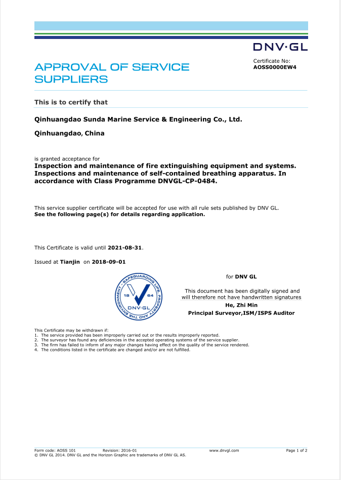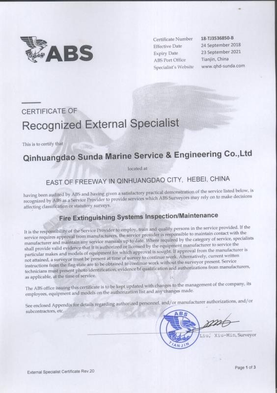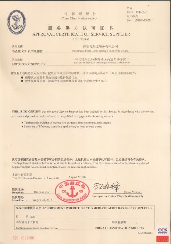 秦皇島順達船務(wù)有限公司位于美麗的海濱城市、中國北方著名的能源輸出大港--秦皇島。公司從事于船舶修理、物料供應(yīng)、水下檢測、船體測厚、消防救生設(shè)備及救生艇檢驗、電氣自動化修理等服務(wù)。 公司自1997年成立至今,先后為國內(nèi)外船東修理、檢驗各類船舶萬余艘,積累了豐富的施工經(jīng)驗。公司現(xiàn)有場地100余畝,員工30余人,以及工程用車若干臺。我們公司一直本著嚴以律己、真誠待人、精益求精、信譽至上的經(jīng)營理念,以優(yōu)質(zhì)的服務(wù)、專業(yè)的施工、合理的收費,得到了國內(nèi)外船東的廣泛認可,贏得了良好的口碑和信譽。 公司已取得了中國船級社(CCS)、美國船級社(ABS)、日本船級社(NK)、德國船級社(DNV GL)等各個船級社的消防救生和救生艇檢驗資質(zhì), ...